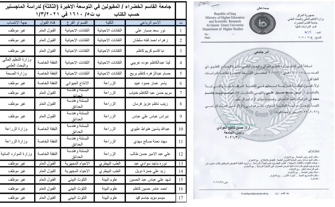 تعلن كلية علوم البيئة – جامعة القاسم الخضراء عن بدء إجراءات تسجيل الطلبة المقبولين ضمن القبول المركزي للعام الدراسي 2025–2026. وتدعو الكلية جميع الطلبة الأعزاء إلى مراجعة شعبة التسجيل في الكلية لإتمام متطلبات التسجيل، مع إحضار المستمسكات الرسمية المطلوبة وفق الضوابط والتعليمات الصادرة عن وزارة التعليم العالي والبحث العلمي. كما تؤكد الكلية على أهمية الالتزام بالمواعيد المحددة للمراجعة لتسهيل إنجاز معاملات التسجيل بدقة وسلاسة، متمنيةً لجميع الطلبة عامًا دراسيًا موفقًا مليئًا بالعطاء والنجاح. ?? المستمسكات المطلوبة للتسجيل أولاً: المستمسكات الثبوتية 1. البطاقة الوطنية للطالب أو هوية الأحوال المدنية مع شهادة الجنسية. 2. البطاقة الوطنية للوالد أو هوية الأحوال المدنية مع شهادة الجنسية. 3. البطاقة الوطنية للوالدة أو هوية الأحوال المدنية مع شهادة الجنسية. 4. بطاقة السكن. 5. البطاقة التموينية. ثانياً: الوثيقة المدرسية 1. الوثيقة المدرسية الأصلية المصدّقة (نسختان ملونتان). 2. في حال عدم توفر الوثيقة عند التسجيل، يُقدَّم تعهد بجلبها لاحقًا. ثالثاً: الفحص الطبي إجراء الفحص الطبي إلزامي، ولا يُستكمل التسجيل بدونه. رابعاً: الصور الشخصية عدد (6) صور شخصية حديثة. خامساً: التثبيت تأييد يثبت إدراج اسم الطالب ضمن قوائم القبول المركزي. سادساً: للمقبولين على قناتي الموازي أو المسائي تقديم كفالة مالية وفق الضوابط والتعليمات النافذة.