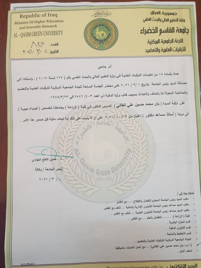 الأستاذ المساعد الدكتور أميرة عمران الجنابي عميد كلية علوم البيئة أعلن السيد
